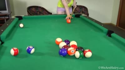 La brunette commence à lécher la queue de billard et se masturbe doucement sa petite chatte pleine de poils. Elle se pelote les seins, elle adore ça