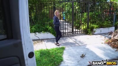 Cette jeune blonde sexy accepte de l'argent pour monter dans le van et se faire baiser devant la camera