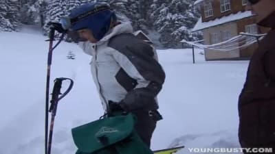 Il a trop la trique alors elle va le chauffer sur la neige avant de se faire baiser comme une petite pute
