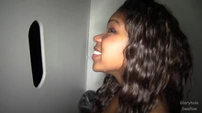 Une jolie black reçois les bites à travers un troue à bite elle suce comme elle peut sans s'arrêter .