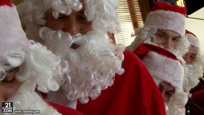 Une femme brune chaude va se faire baiser par deux pères noel après les avoir bien sucer comme ils voulaient