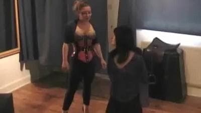 Cette trans va subir un châtiment plutôt agréable pour elle. La meuf se fait dominer par un mec masqué et une nana dominante.