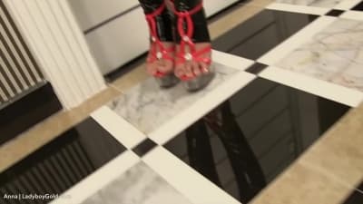 Cette jeune transsexuelle dominante adore le cuir. Elle aime aussi écarter son trou du cul, avant de se faire pénétrer par la teub.