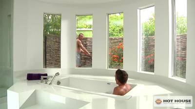 Le minet se masturbe dans la baignoire et observe son pote qui fait du jardinage. Il s’aperçoit de ça et le rejoint dans la salle de bain pour baiser.