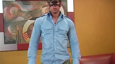 Ce policier ne veut pas être reconnu, alors il se met un masque pour cette scène porno. Il se déshabille et montre ses muscles avant de se branler.