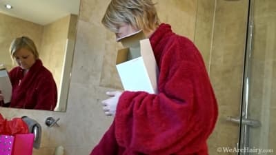 Daniella, une blonde à la chatte poilue nous invite à prendre une douche. Elle vous montre comment elle se lave et se caresse avec le jet d'eau.