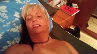 Cette maman sexy blonde profite bien de son corps en se caressant. D'abord ses gros nichons, puis ensuite sa chatte. Son mari l'observe.