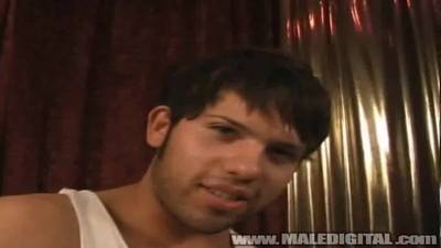 Le mec se rafraîchis un peu le corps. Tellement de poil ça le chauffe. Il va montrer son cul en l’écartant et se masturber, étalant le foutre sur son corps