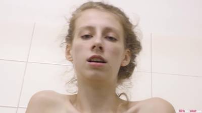 Cette demoiselle dans la salle de bain bien verte va pisser sous la douche, se caresser la vulve et utiliser un petit vibromasseur