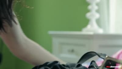 Une brune en chaleur sur le lit est excitée après s'être touchée et son petit ami commence à lui lécher la chatte et la baise après.