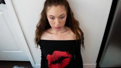 Accroupie, Anna Blossom lèche le gland de son gars et suce lentement