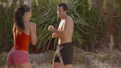 Alexa fait de la lute avec son pote, il va mouiller le tee shirt et la peloter, il la soulève pour lécher sa chatte et lui donne des coups de reins debout
