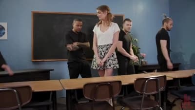 Un gang-bang plutôt hard dans cette salle de classe avec jeune blondinette et elle kif ça, avec plusieurs hommes.