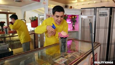Cette fleuriste est une sacrée salope qui donne sa chatte à lécher, qui suce la bite et qui baise son stagiaire