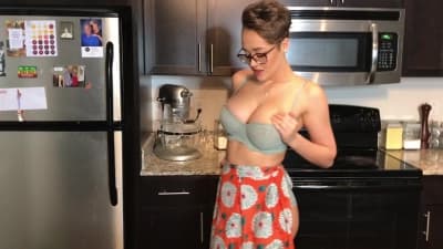 Sabrina Nichole fait balancer ses gros seins naturels. Elle met de la chantilly dessus et lèche, finissant par se masturber et lécher les doigts