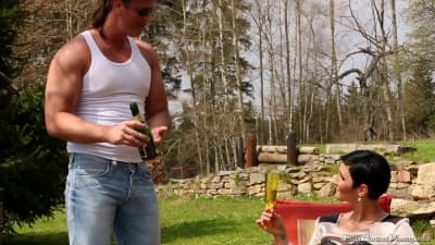 Elle fait le bonheur d'un petit fermier en se la prenant profond dans la chatte, et en se faisant renverser du champagne dessus comme une chienne