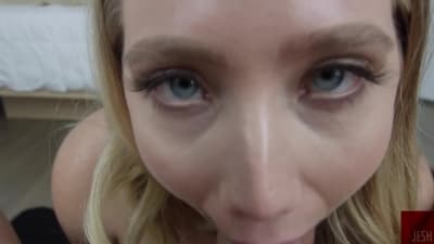 Elle se met à genoux pour bien prendre en bouche son gros sexe et pour le faire bien jouir sur son visage d'anges ! C'est une gourmande