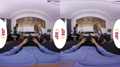 Les deux femmes de ménage vont faire le lit avant de sucer la bite et grimper dessus, elles vont extraire le jus de couille en VR.