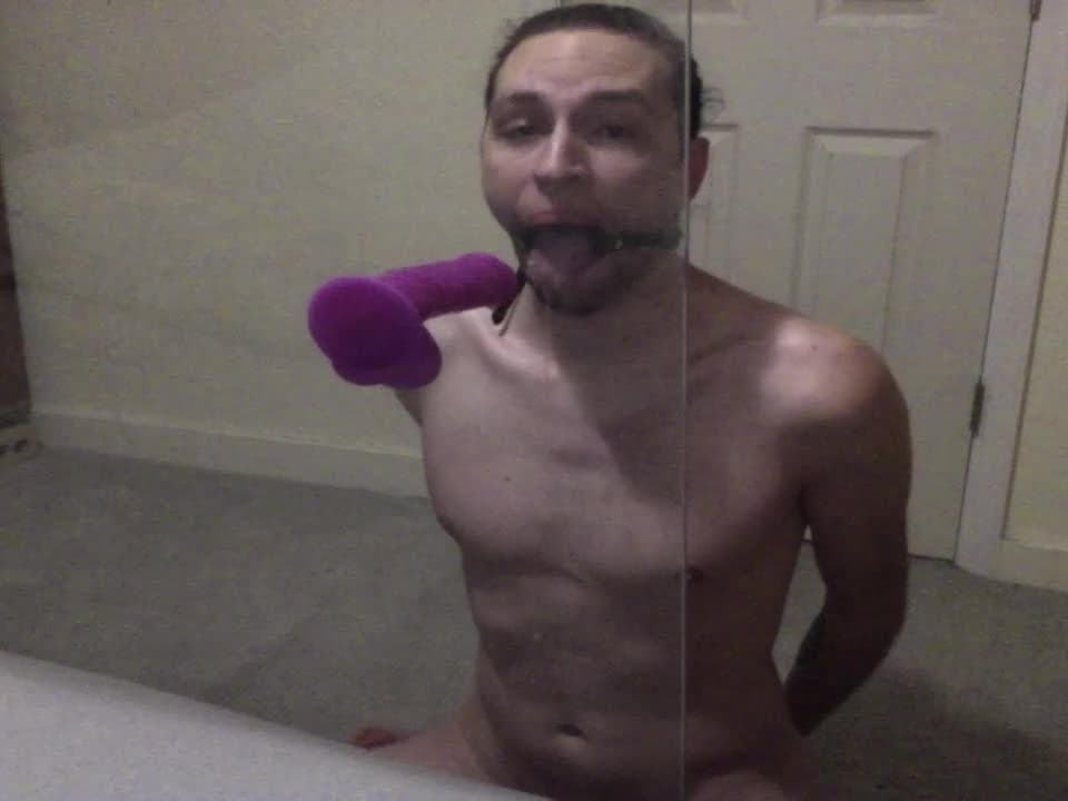 Le type met une boule-bâillon dans la bouche et des menottes. Il va sucer un dildo et l'enfoncer au fond de sa gorge