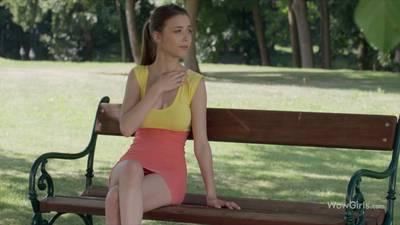 Cette petite coquine va profiter d'un moment en extérieur pour se donner du plaisir au soleil ! c'est sur ce banc du village que sa chatte va mouiller
