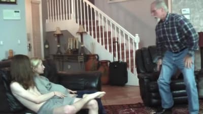 Une femme blonde jeune et chaude va être avec un homme avec les cheveux long qu'elle va commencer par sucer avant de se faire prendre sur le canapé