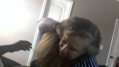 Dans leur chambre cette vieille femme blanche est filmée par son homme black, qu'elle branle et suce jusqu'à éjaculation sur leur lit