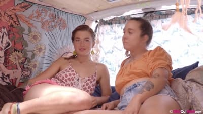 Les deux lapines ont décidé de vivre dans un van pour pouvoir être à l'aise, faire du bruit et baiser sans problème. Elles se lèchent et se godent l'anus