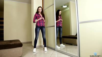 La brune en jeans et chemise va se dénuder en douceur, elle adore faire de l'exhib soft, elle caresse sa petite vulve et son petit cul.