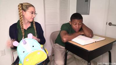 Ce jeune lascar va baiser une camarade durant l'heure de colle, la jolie blonde va sucer la bite avant de se faire limer sur le bureau.