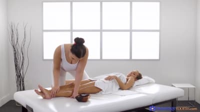 La jolie brunette va avoir le droit à un massage exceptionnel, elle se fera huiler le corps et caresser la chatte par la masseuse.