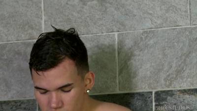 Liam se retrouve à genoux au sol pour pépom la bite de ses potes sous la douche. Il prend un temps pour lui pour se taper sa meilleure branlette en solo.