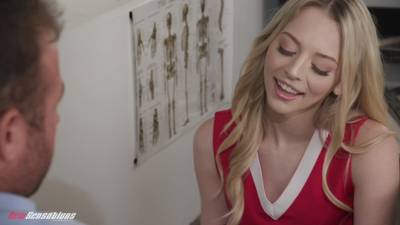 Une étudiante blonde remercie le prof à sa façon. Elle lui suce la queue et se fait prendre sur le bureau avant d'en prendre plein le visage.