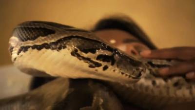 Une jolie Indienne fait sa danse sexy, se déshabille et se caresse au lit avec un long et gros serpent.