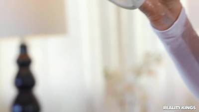 Kendra Sunderland joue avec un liquide avant de sucer et de se faire baiser sur la table de la cuisine. Elle en redemande toujours plus.