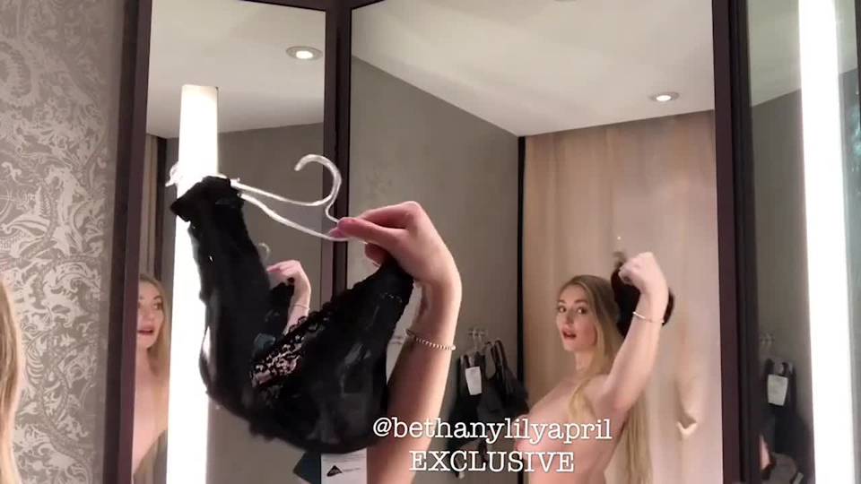 La jolie blondasse montre ses gros nichons en essayant plusieurs soutiens gorge dans une cabine d'essayage, elle donne envie de la baiser dedans