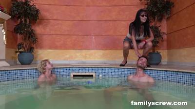 Le lascar va plaire à la grand-mère du pote, elle va le branler et il va la baiser sur le bord de la piscine, les deux autres vont mater