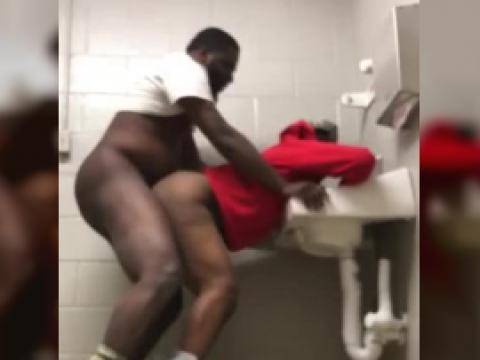 Les deux mecs s'enferment dans les WC publiques, ils pratiquent la sodomie sur le lavabo en levrette debout avec une éjac interne à la fin