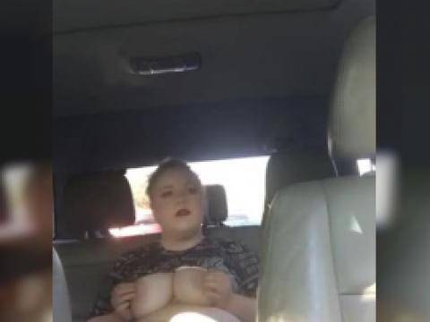 Personne aux alentours, alors c'est bon pour une masturbation solo dans la voiture. La bbw Effy Grace va utiliser un sextoy et jouir sur le cuir