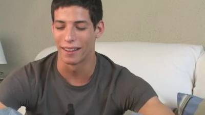 Ce beau garçon aux yeux clairs fait un strip tease, s'allonge et masturbe sa teub finissant par se gicler sur le ventre.