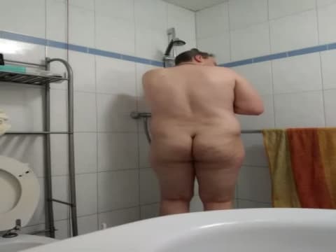 Ce gros type prend une douche avec la caméra allumée. Il aime montrer son cul et quand il commence à s'essuyer, il montre aussi sa bite