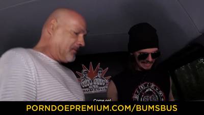 La star brune sexy du porno baise un vieil homme chanceux après une pipe humide et excitante à l'intérieur d'un van.