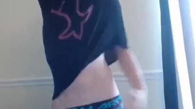 Ce jeune blondinet a une énorme bite et il adore la flasher sur le web. Il s'exhibe devant sa cam, se branlant avec agilité et finit par gicler partout !