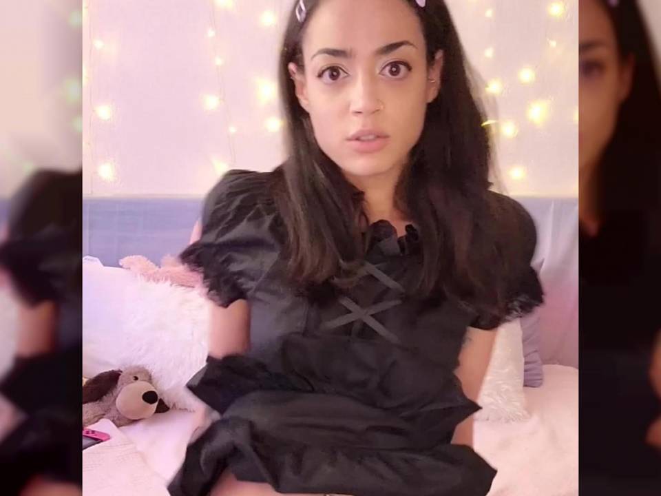 Elle est toute mignonne avec sa robe noire et ses barrettes dans les cheveux. Elle relève sa robe et se masturbe devant sa cam pour nous faire bander.