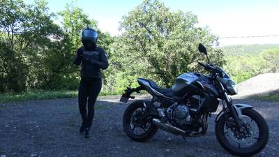 La brune sexy s'excite en conduisant sa moto. Elle frotte sa chatte contre la moto et gicle dessus.