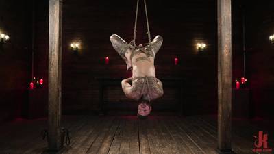 La brune adore le BDSM, elle va attacher avec des cordes un mec vraiment tatoué, ensuite elle va sortir une ceinture gode et lui démonter le cul.