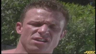 Kevin Miles et Johnny Rahm dans une vidéo porno gay en train de baiser à la piscine en se relayant pour s'envoyer en l'air et se baiser