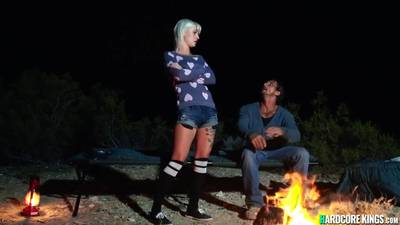 Gros seins faux, corps sexy tatoué, bombe blonde Kleio Valentien et son partenaire Tommy Gunn baisant la nuit sous les étoiles à côté du feu en camping