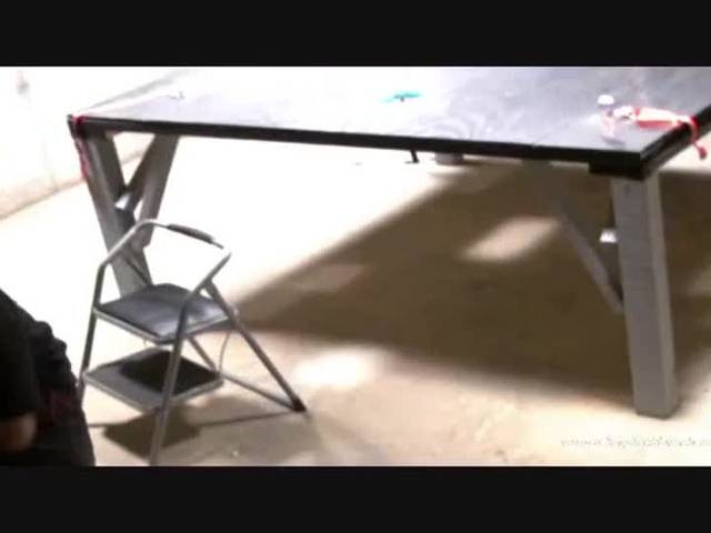 Ce type innocent se fait attacher à la table. Il se fait dominer et fouetter par des grosse transsexuelles noires. Le pauvre doit être courageux pour ça.