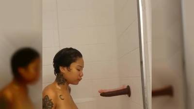 Cette belle asiatique tatouée va coller ses gode-ventouse dans sa douche, va les sucer et les baiser avant de se mettre des doigts dans le cul pour jouir