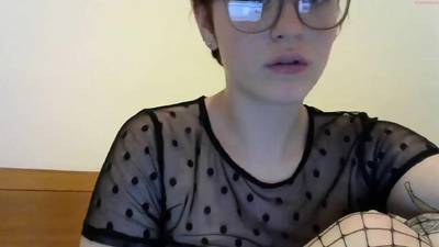 La fille amateur aux cheveux courts, a ses gros seins dans une chemise transparente et elle porte des filets de pêche noirs pendant qu'elle se touche